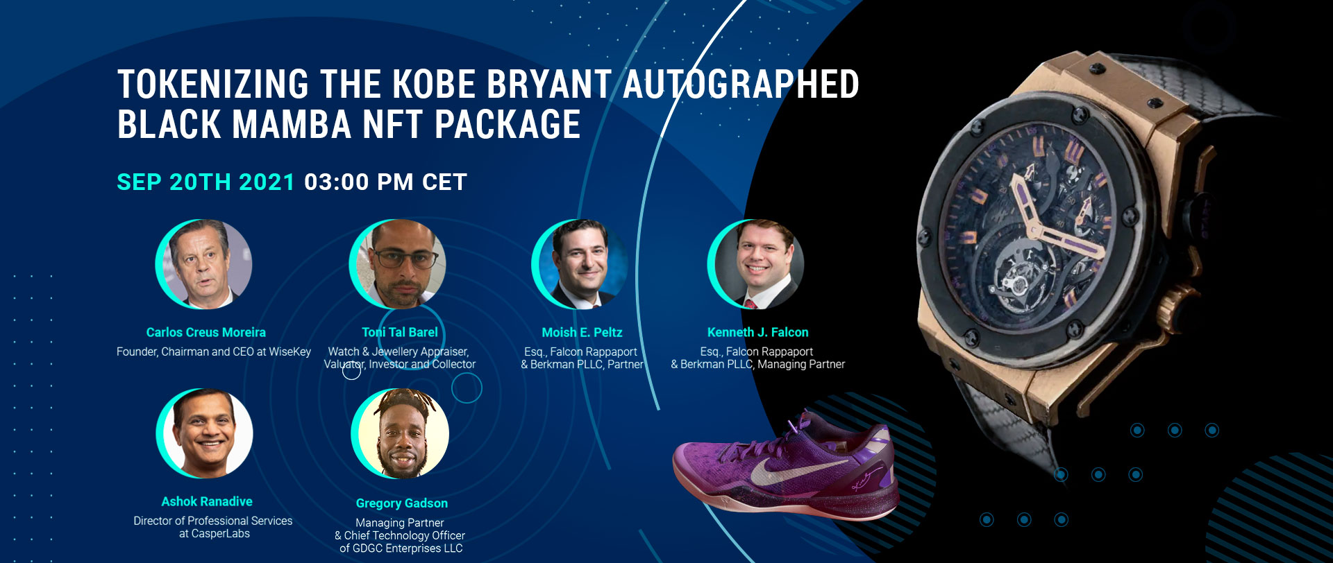 | Speakers | – Toni Tal Barel, Watch & Jewellery Appraiser, Valuator, Investor and Collector – Moish E. Peltz, Esq., Falcon Rappaport & Berkman PLLC, Partner – Kenneth J. Falcon, Esq., Falcon Rappaport & Berkman PLLC, Managing Partner – Ashok Ranadive, Director of Professional Services at CasperLabs – Gregory Gadson, Managing Partner & Chief Technology Officer of GDGC Enterprises LLC |