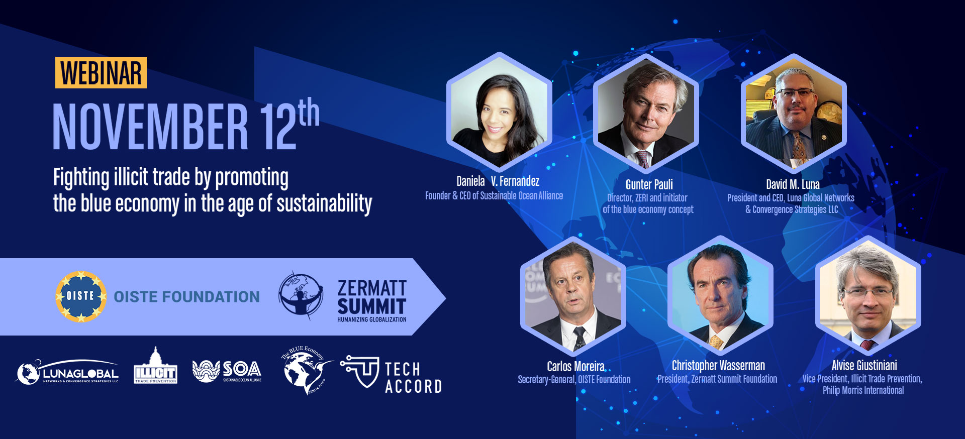 | Speakers | – Carlos Moreira: Secretary-General, OISTE Foundation – Daniela V. Fernandez : Founder and CEO of the Sustainable Ocean Alliance – Christopher Wasserman: President, Zermatt Summit Foundation – Alvise Giustiniani: Vice President, Illicit Trade Prevention, Philip Morris International – Gunter Pauli: Director, ZERI and initiator of the blue economy concept – David M. Luna: President and CEO, Luna Global Networks & Convergence Strategies LLC |